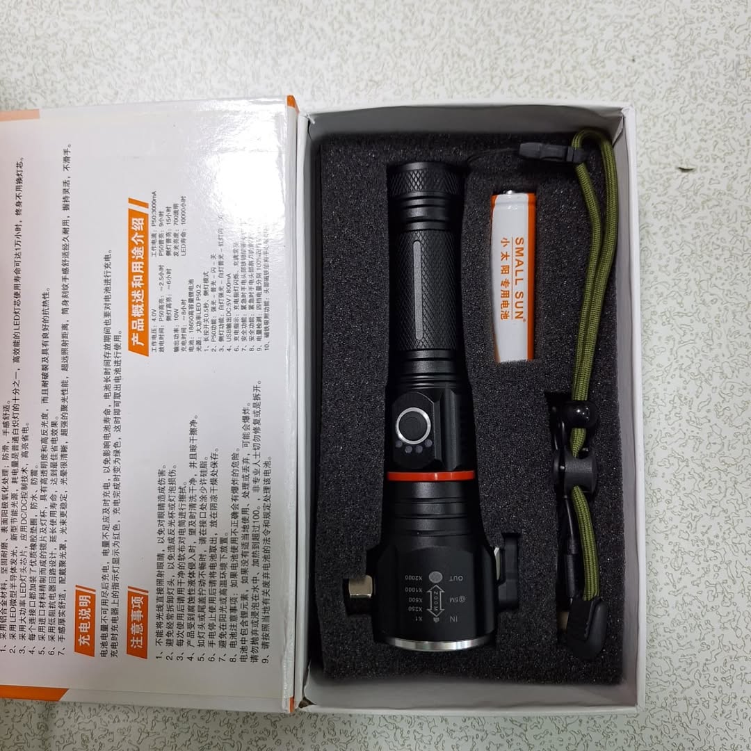 چراغ قوه چکش دار اسمال سان قابلیت شارژ گوشی دارای چکش و تیغ مخصوص کمپینگ دارای چراغ پلیسی و فانوس باطری خوروقابل تعویض یگان ویژه شاپyegan.vizhe_shop